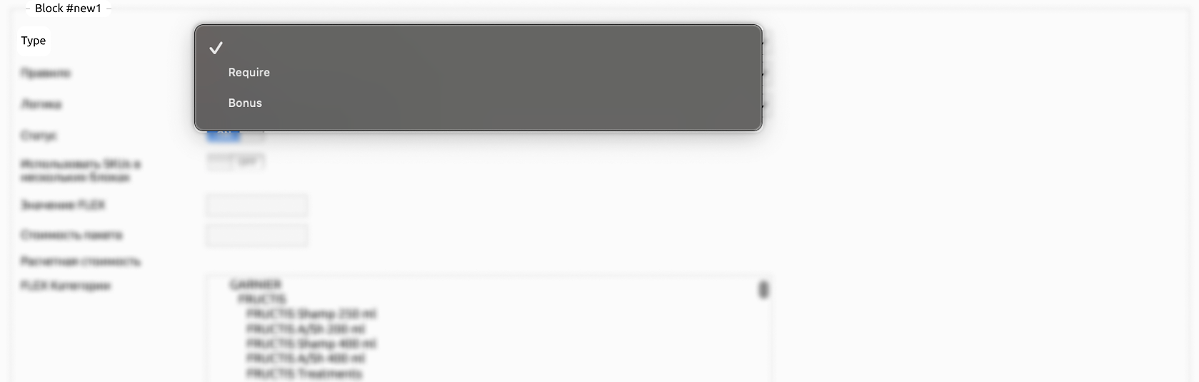 Данное правило работает так же, как "Flexible single SKU", то есть из списка товаров требует выбрать один товар и набрать его в указанном количестве (требуемое количество указывается в поле "Значение FLEX"), но отличается тем, что не требует блока BONUS