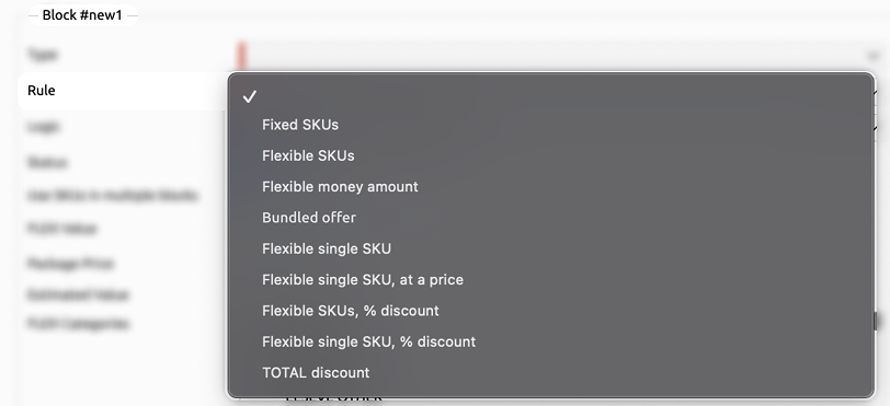 В блоке BONUS можно указать, например, Fixed SKUs, чтобы создать конкретный пакет товаров, или Flexible SKUs, чтобы позволить заказчику собрать пакет самостоятельно