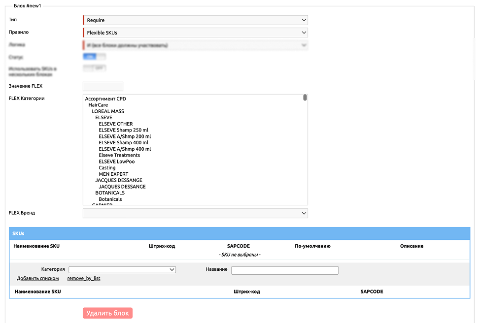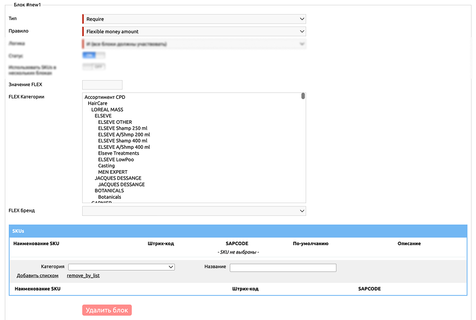 Далее вы можете выбрать конкретные товары, участвующие в промо, в таблице "SKUs", либо указать "FLEX категорию" товаров, чтобы не выбирать их по отдельности
