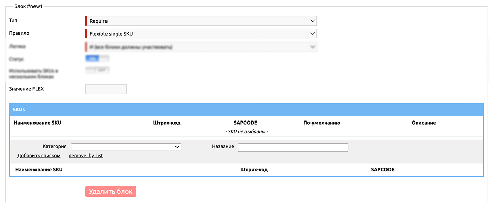 Данное правило работает так же, как "Flexible SKUs", то есть из указанного в таблице "SKUs" списка товаров требуется набрать любых товаров в общем количестве, указанном в поле "Значение FLEX", но отличается тем, что не требует блока BONUS